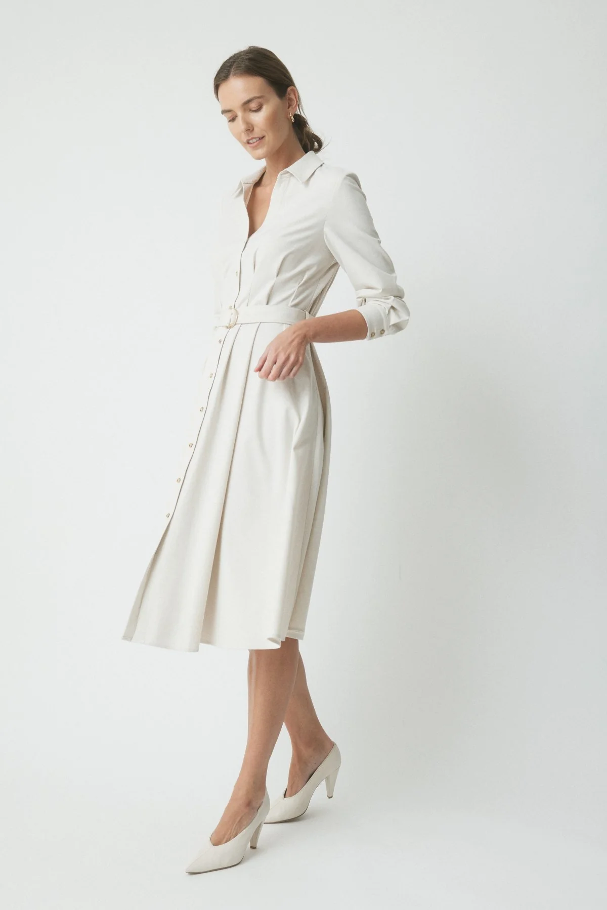 The Alex Shirt Dress blends tailored structure with refined femininity. Crafted in a collared shirtdress silhouette, it features tuck detailing at the waist, a structured front placket, and three-quarter sleeves. Inseam pockets and mid-calf length complete this versatile wardrobe piece.