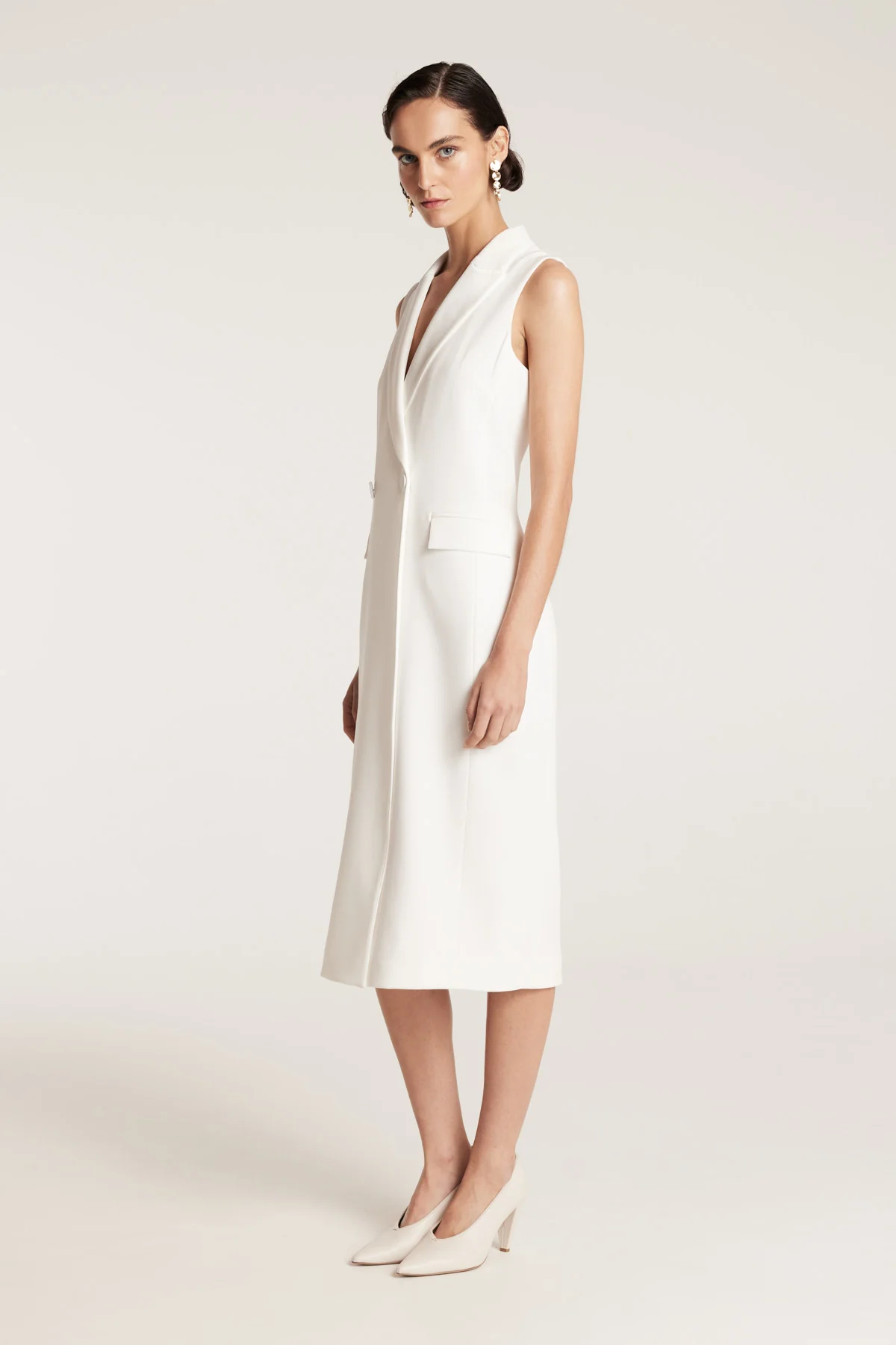 A modern interpretation of tuxedo styling, the Diana Dress is crafted from signature Japanese matte suiting in a structured, double-breasted silhouette. Featuring notched lapels, flap welt pockets and full lining, this tailored piece brings sharp sophistication to event or evening dressing.