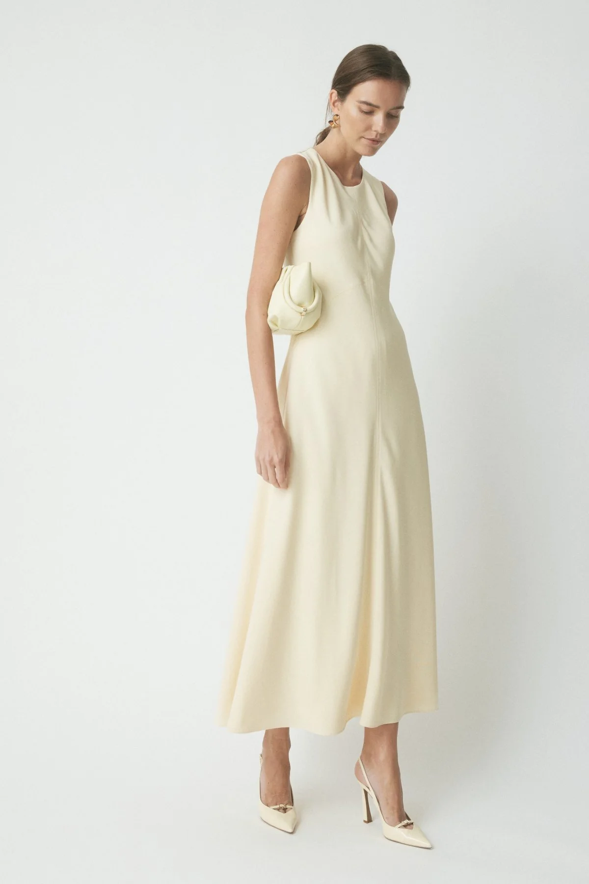 The Ivy Maxi Dress offers a refined silhouette with tailored structure and flowing movement. Designed with a crew neckline and sleeveless cut, it falls to an ankle-length hem with a softly flared bias skirt. Seam detailing and full lining complete this timeless occasion piece.