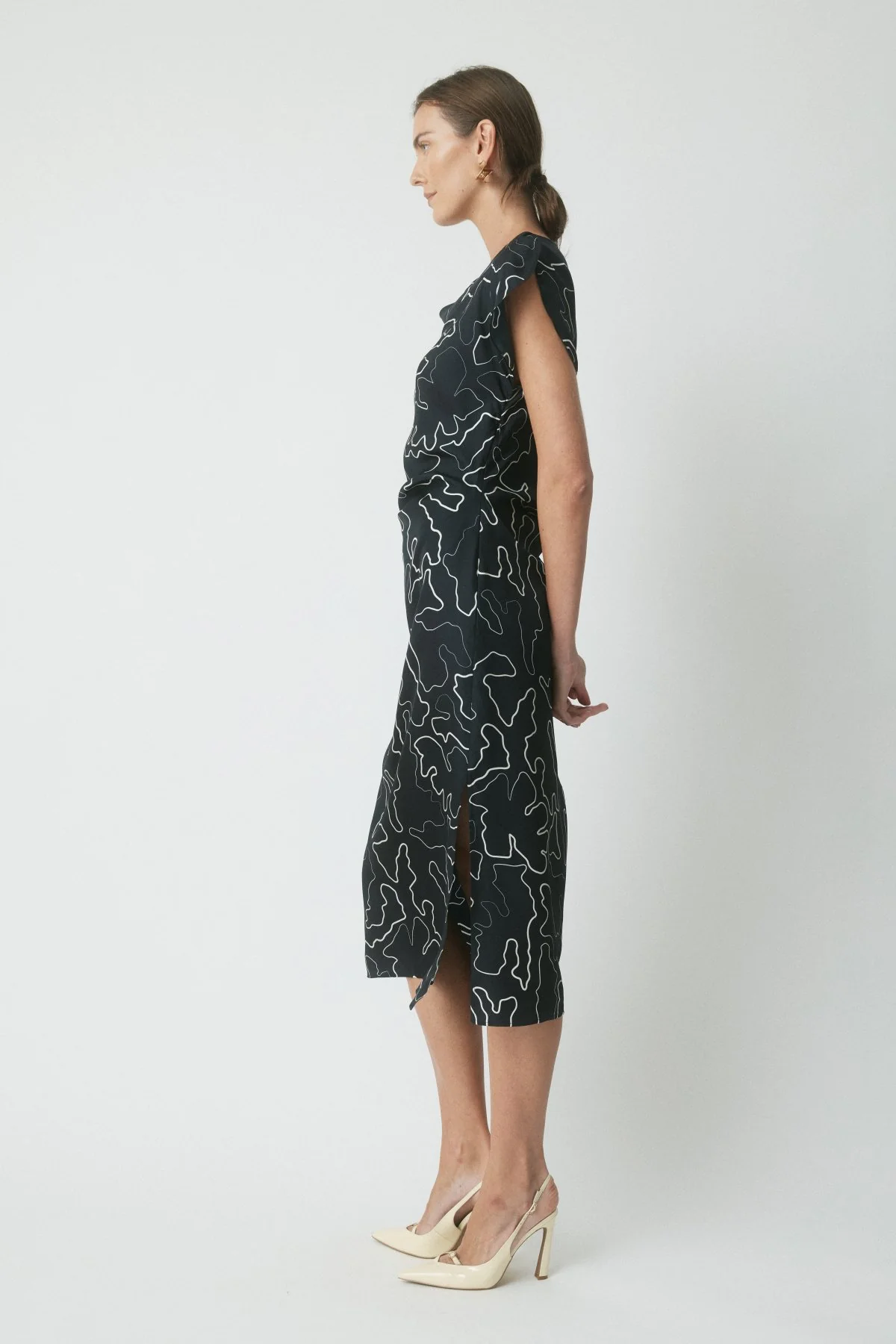 The Milan Printed Silk Dress brings a polished approach to event dressing, showcasing an exclusive print on lustrous silk twill. Its draped silhouette is defined by a soft cowl neckline, gathered side detail and a bias-cut skirt that falls to mid-calf length.