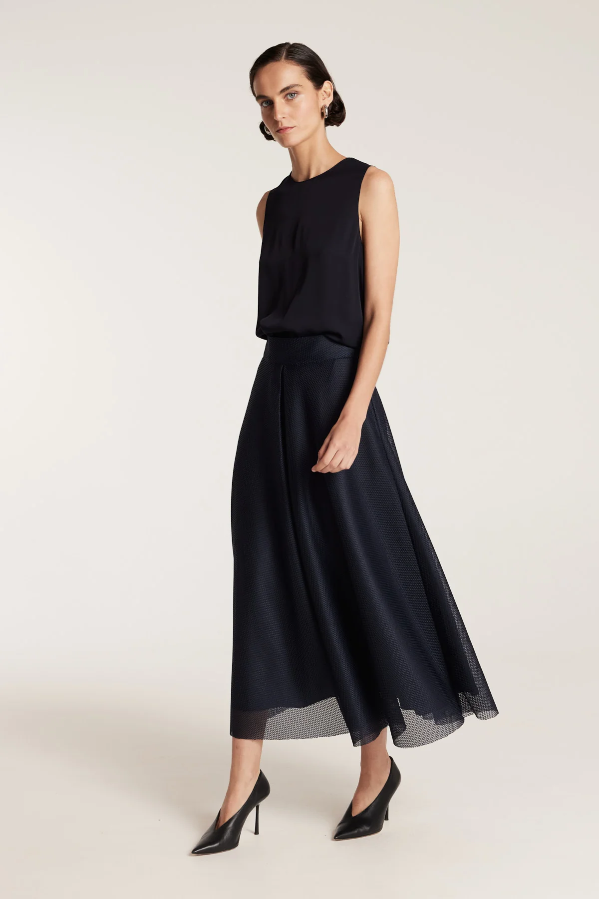 The Core Silk Singlet is a timeless foundation piece crafted from 100% silk georgette. It features a round neckline and a discreet hook and eye closure at the back, offering a clean, refined finish ideal for layering or standalone wear.