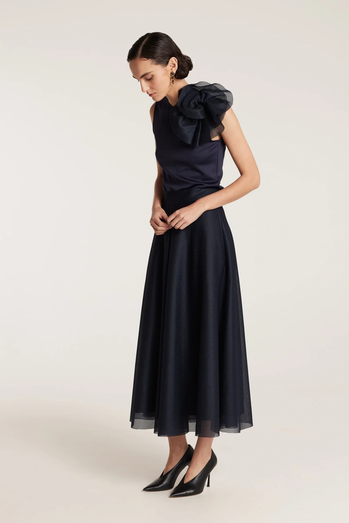 The Rosette Top is an elevated event separate, blending structured knitwear with sculptural detail. Featuring a luxurious Ponte bodice and cropped silhouette, it is finished with a round neckline and striking rosette detail in honeycomb lattice mesh. A zip at the back ensures a seamless fit.