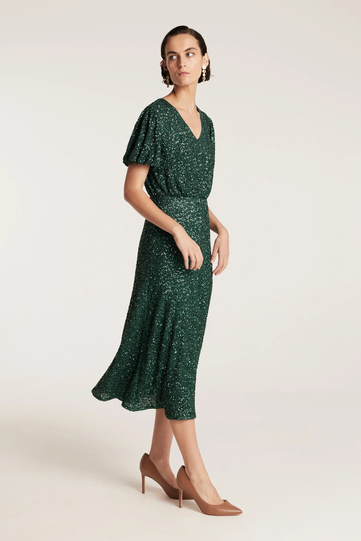 Designed to shine, the Sequin Dress features a flattering midi silhouette with gathered detail at the waist. Blouson sleeves and a V neckline create soft volume, while a hook and eye closure at the back neck adds a refined finish. Fully lined for comfort, this piece is ideal for evening and event dressing.
