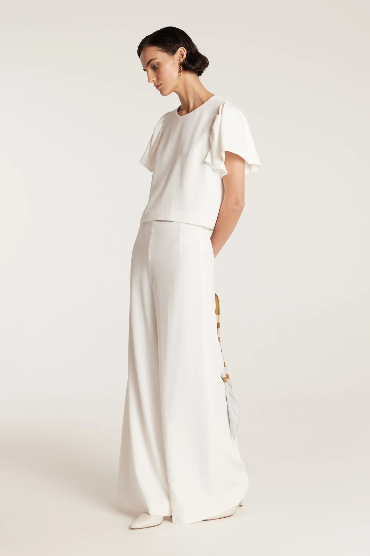 The Ruffle Sleeve Top brings a modern femininity to structured dressing. Made in Australia, it features soft ruffled short sleeves, a round neckline and cropped bodice that pairs seamlessly with high-waisted tailoring. Bust darts and full lining provide a smooth, refined finish, while an invisible centre back zip allows for effortless wear.