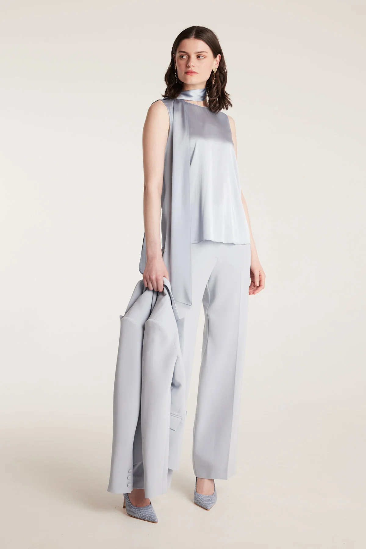 The Silk Tie Top is crafted from stretch silk satin in a refined sleeveless silhouette. A detachable neck tie and keyhole opening at the back lend subtle detailing to this versatile piece. Designed with a regular fit, it offers a polished option for both day and evening styling.